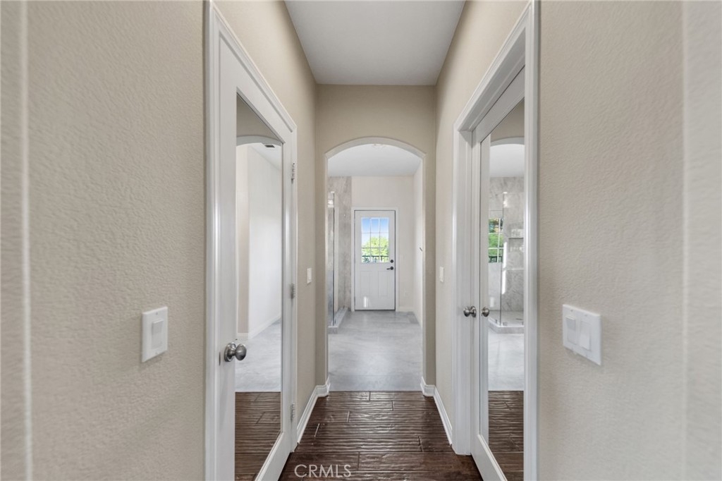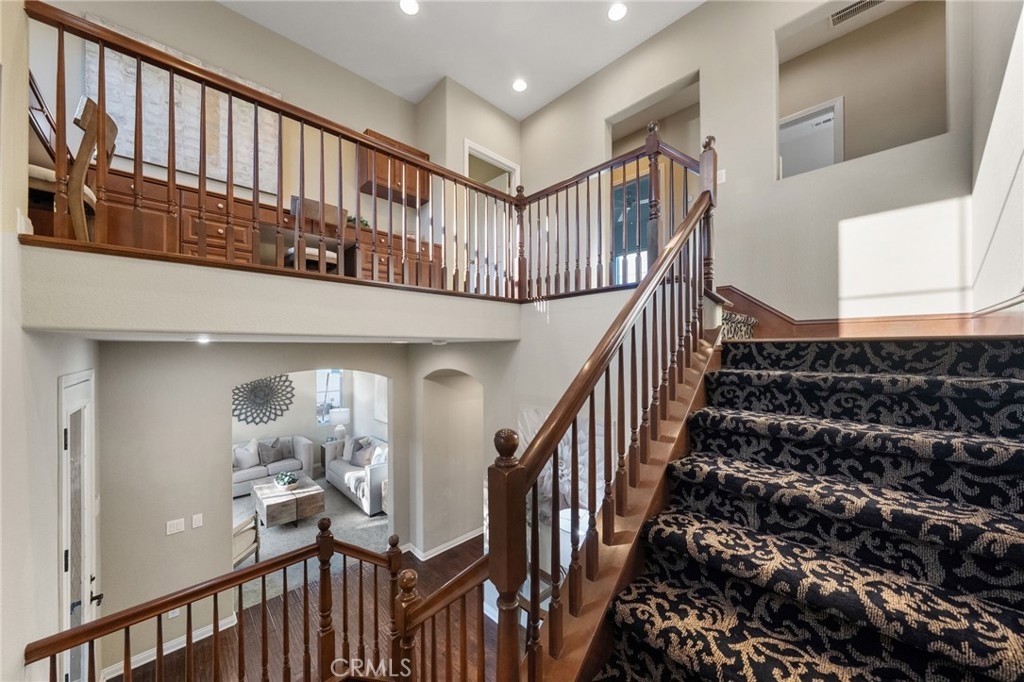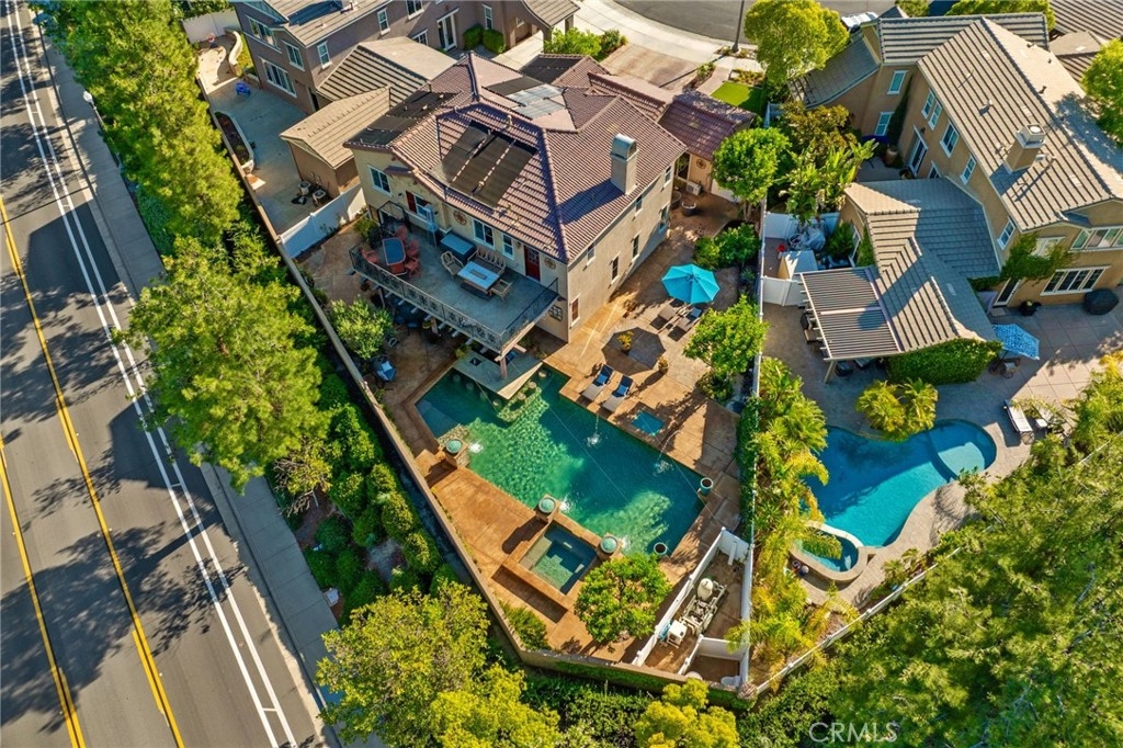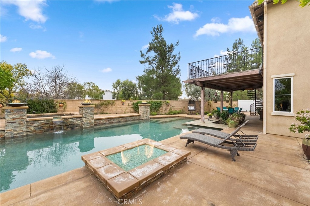 Resort-caliber living at the highest elevation in Harveston. Designed for those who value privacy, presence, and elevated living, this exceptional residence offers a rare blend of architectural refinement, thoughtful upgrades, and true resort-style outdoor living. From the moment you arrive, the custom beveled-glass front door and architecturally designed stairwell set a tone of quiet luxury. Rich rubber tree wood flooring flows throughout the main living areas, while the upgraded slate-stone fireplace surround anchors the space with texture and sophistication. The kitchen has been thoughtfully enhanced with a brand-new stainless-steel stove and hood vent, deep stainless sink, tucked-away microwave, hidden trash bins, and an additional water line outside the kitchen window providing future customization. The refined layout includes a private separate casita ideal for a home office, yoga room, or guest retreat with views of the courtyard leading to the outdoor living area, complemented by an upgraded half bath on the main level. The primary suite is a true retreat featuring upgraded quartz countertops, new fixtures and lighting, an enlarged custom stone shower, and direct access to the upper patio for seamless indoor-outdoor living. Two walk-in closets thoughtfully separate the bedroom from the bath. The secondary bathroom continues the luxury experience with custom granite countertops and dual sinks. Wood flooring extends through the upstairs hallways, primary bedroom, and closets, while a tiled laundry room adds durability and polish. Step outside to a private backyard resort designed for entertaining and relaxation featuring an engineered patio cover with massive distressed wood beams, a dramatic spiral staircase leading to an upper deck with views framed by wrought-iron railing, and a Pebble Tech pool surrounded by stacked stone, waterfalls, arched water features, and stone pillars topped with copper fire bowls filled with aqua-blue glass. A swim-up bar with granite counters, sink, and refrigerator delivers true resort functionality, complemented by a glass fire pit, spacious spa, and a discreet poolside bathroom. A generous side yard off the courtyard—rare for Harveston—offers additional space for entertaining or personalization. A paid water solar system for the pool and spa completes this exceptional offering. More than a home, this is a lifestyle defined by elevation, intention, and comfort. A rare Harveston opportunity. Let’s make it yours.