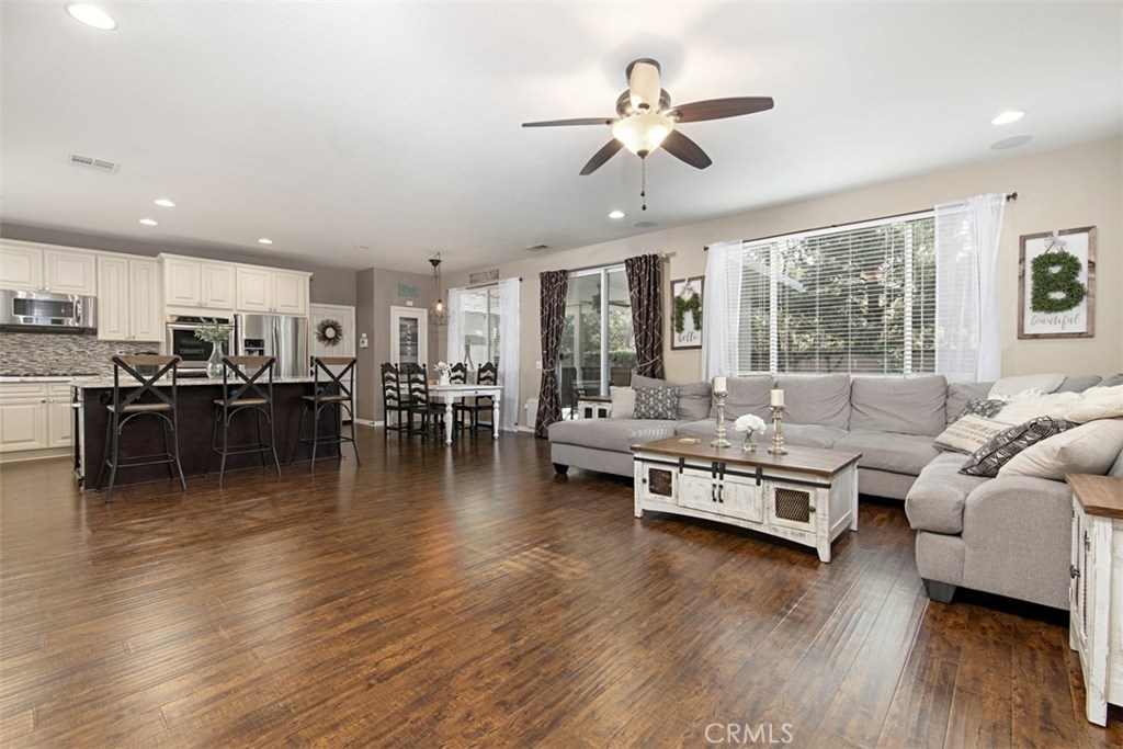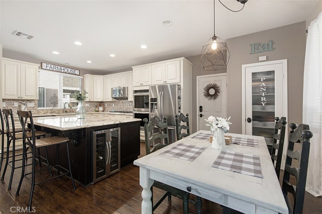 Nestled in the highly desired amenity-rich community of Harveston Lake this home has it all. Meticulously maintained with many custom touches. The kitchen has been modernly upgraded with custom cabinets, granite countertops, large island with wine fridge, stainless steel appliances, touch sensor kitchen faucet, double ovens, & trash compactor. The kitchen opens to a spacious family room with built-ins, surround sound system and a cozy fireplace. Entry-level also features a bedroom with full bath, separate living room, & formal dining room. Enjoy upscale elements in the master suite which boasts glamorous bedroom lighting, designer barn door entry to the renewed master bathroom which offers dual vanities with designer fixtures & separate soaking tub. Off the master bathroom is an expansive walk-in closet with a custom closet organization. 3 additional spacious bedrooms upstairs, also there is a desk work area and a convenient laundry room. Back yard highlights are a newer patio cover with fan, lighting, and misters to enjoy warm summer nights outdoors, a fenced yard, & an artistic succulent planter. Home offers: water softener/filtration system, whole house fan, 3 car garage with epoxy flooring, shelving and storage racks galore, solar system (easy to transfer) enjoy Edison rebate. Security system, nest system thermostats, and exterior cameras. Cul-de-sac makes it a perfect location Come check out this home and explore the neighborhood.