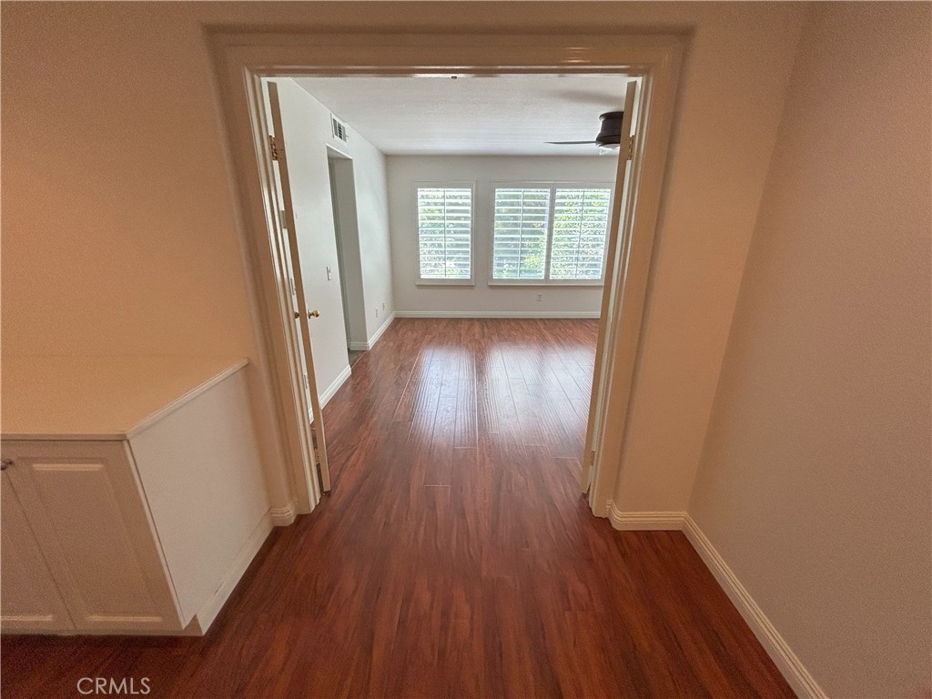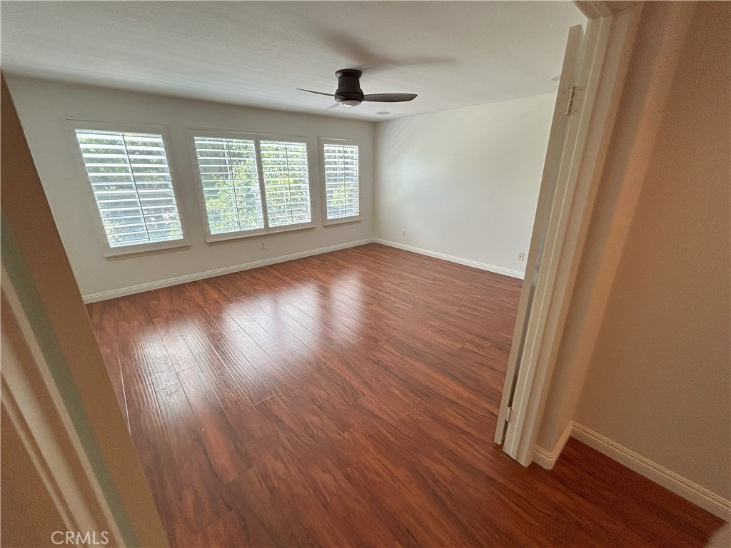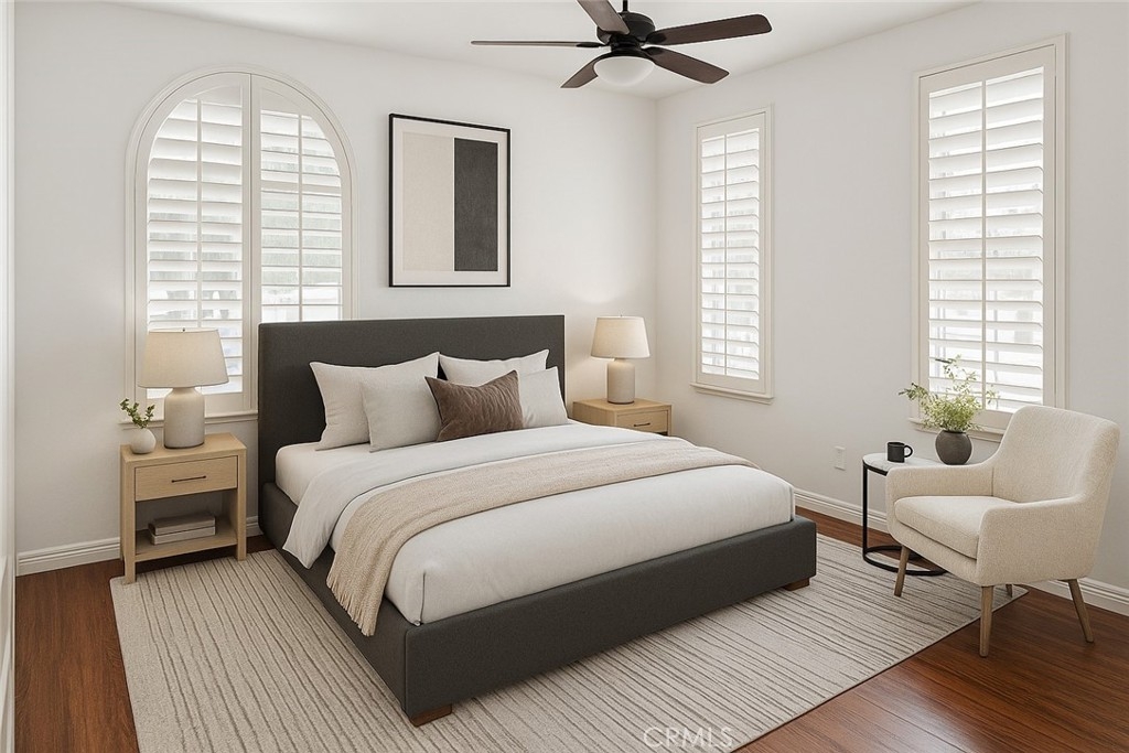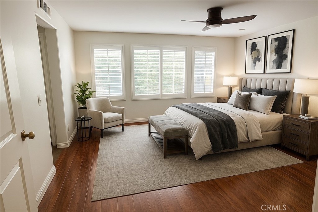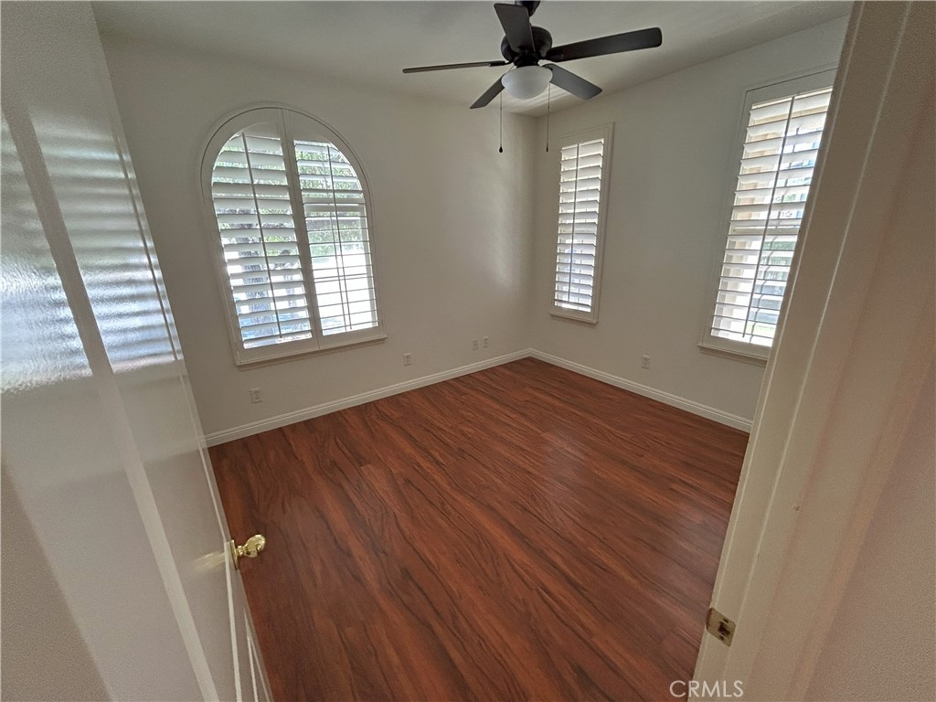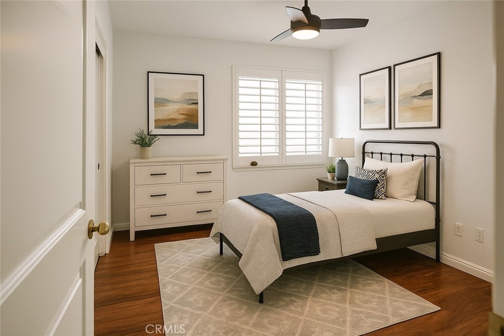 Inside, you’ll find fresh designer paint, elegant plantation shutters, and newer laminate flooring throughout. The versatile layout offers one bedroom and full bath on the main level—ideal for guests or multi-generational living. Upstairs features three additional bedrooms, two bathrooms, and a bonus office that can easily convert into a fifth bedroom with its own mini walk-in closet.